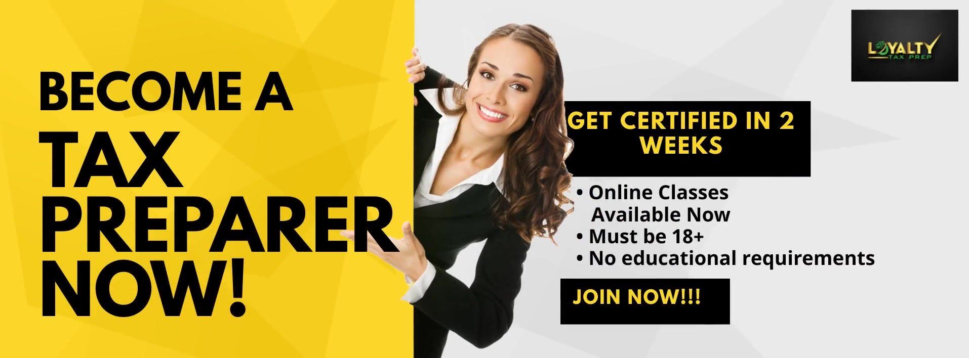 Become a Certified Tax Preparer in 2 weeks!!We offer online and in-person classes through out the year. Online classes are available now, click the link below to get started.